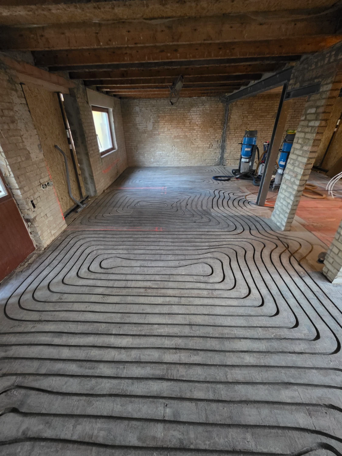 Die Dauer hängt von der Größe und Beschaffenheit der Fläche ab. In der Regel sind wir bei einem Einfamilienhaus innerhalb von ein bis drei Tagen mit dem Fräsen, der Rohrverlegung, dem Verschließen der Nuten sowie dem Anschluss an den Heizkreisverteiler inklusive Druckprüfung fertig.