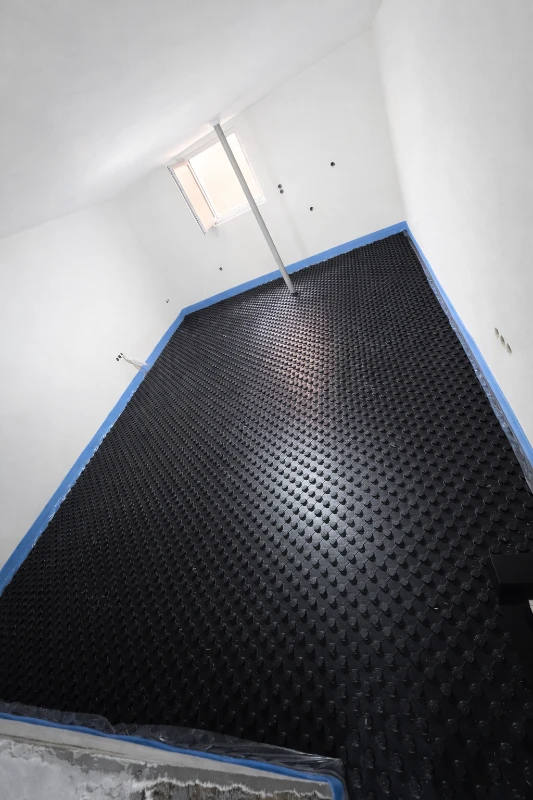 Zunächst werden die Noppenplatten auf dem vorbereiteten Untergrund verlegt. Je nach Aufbau kommen Platten mit oder ohne integrierte Dämmung zum Einsatz.