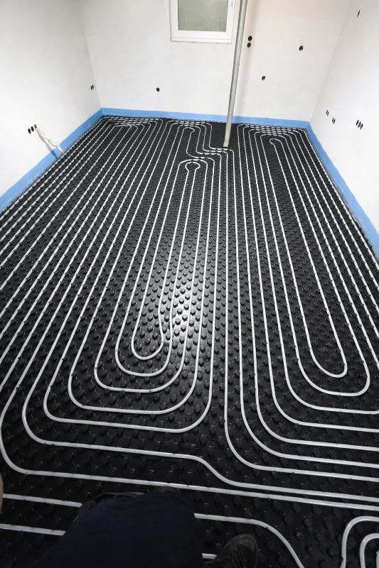Anschließend werden die Heizrohre zwischen den Noppen eingelegt. Die Noppen geben den Verlegeabstand vor und sorgen für eine sichere Fixierung der Rohre. Übliche Verlegeabstände liegen bei 10 cm oder 15 cm, abhängig von Heizlast und Nutzung des Raumes.